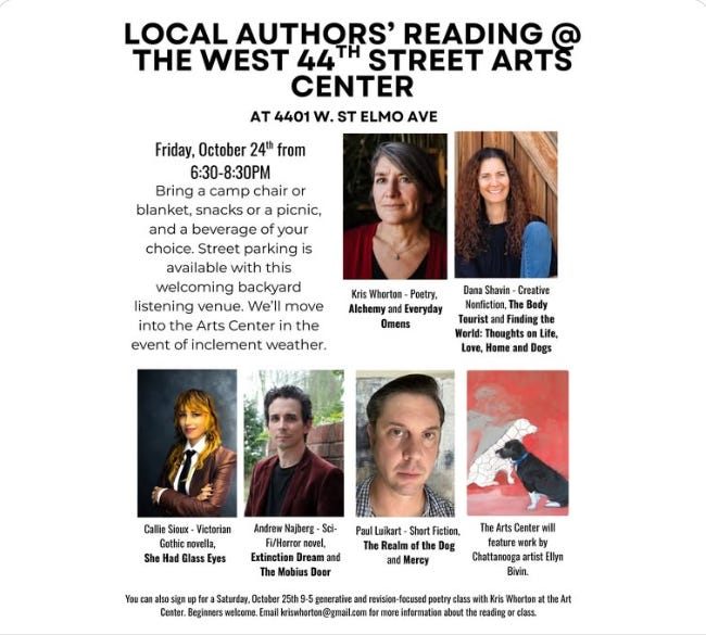 Second, I’m thrilled to be a part of this reading tomorrow night (Friday, 10/24/25.) Me, Dana Shavin, Kris Whorton, Andrew Najberg, and Callie Sioux. At the 44th Street Arts Center (4401 W. St. Elmo Ave.) in St. Elmo, from 6:30PM - 8:30PM. I’d love to see you there!