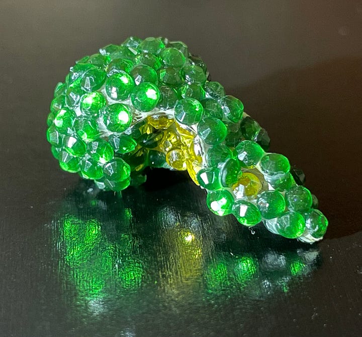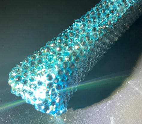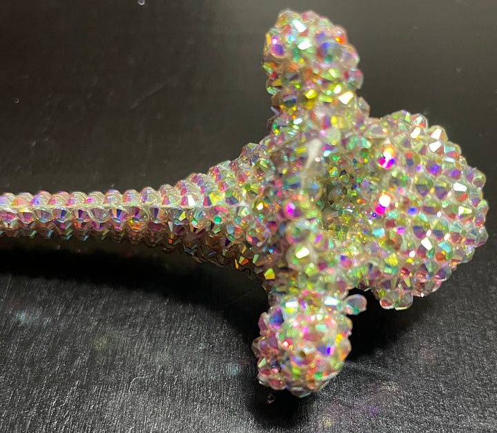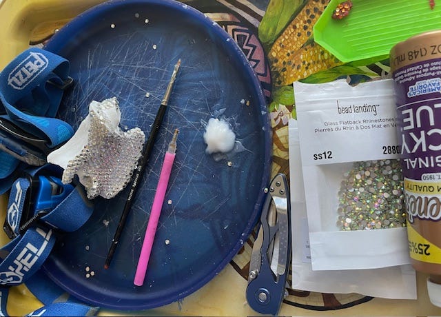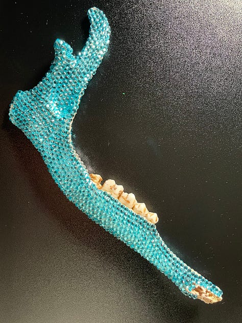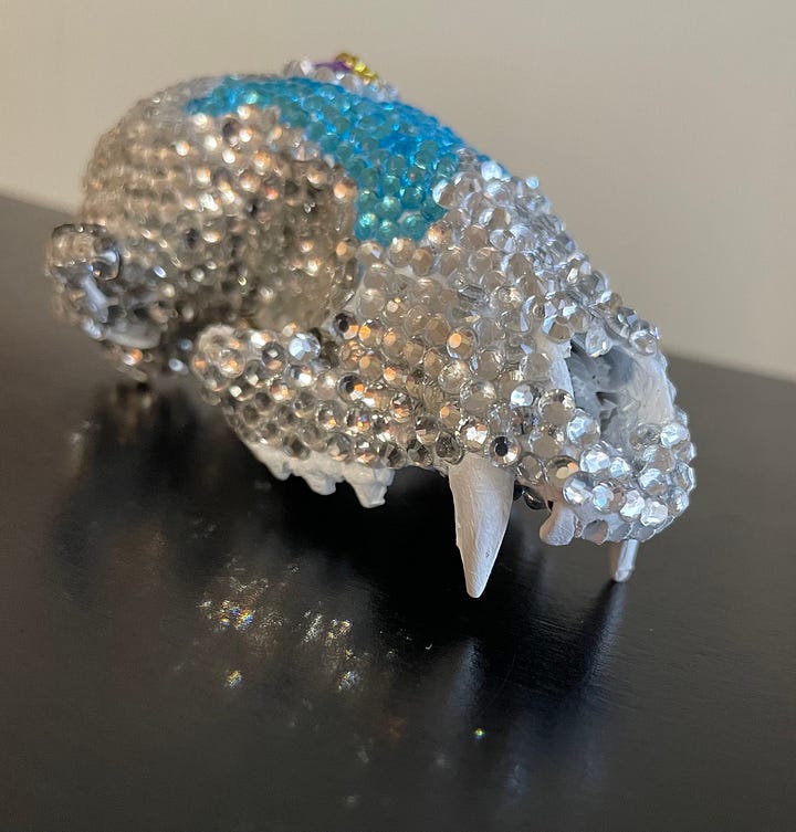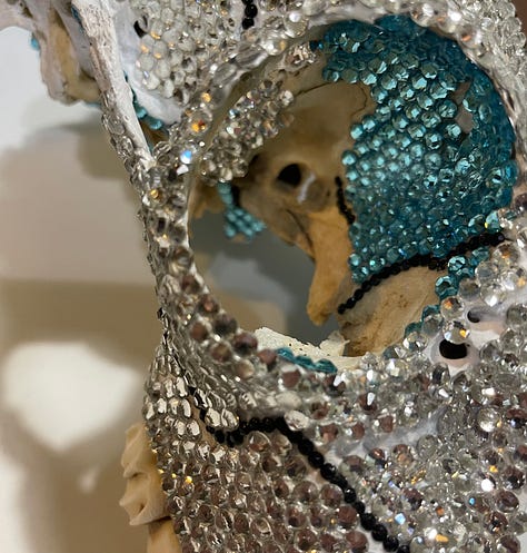 Applying the rhinestones involves tons of repetition, which is, in some way, very soothing to my brain which is always going in a million directions at once. Putting sparkling things onto bones, just as a concept, must include an enormous tip of my hat to Damien Hirst and his 2007 sculpture For the Love of God, which is one of my favorite pieces of art ever made. Whereas I use woodland animal bones and glass rhinestones, Hirst used a human skull and real diamonds. Let’s say I don’t yet have the patronage for that. Whereas his piece is a deeply soul-shattering momento mori meant for contemplation, the stuff I do is more like booth-at-state-fair-meant-to-be-won-at-the-shooting-game-best-enjoyed-with-a-funnel-cake. Which is fine by me.